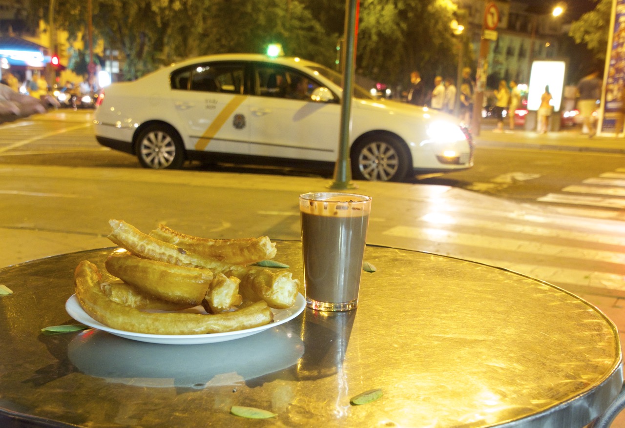 - Late night dessert with Churros, Spanish doughnuts dipped in a glass of thick hot chocolate – oh my! Or, a scoop of helado (ice cream) – seville mora was our favorite at this spot by our hotel!