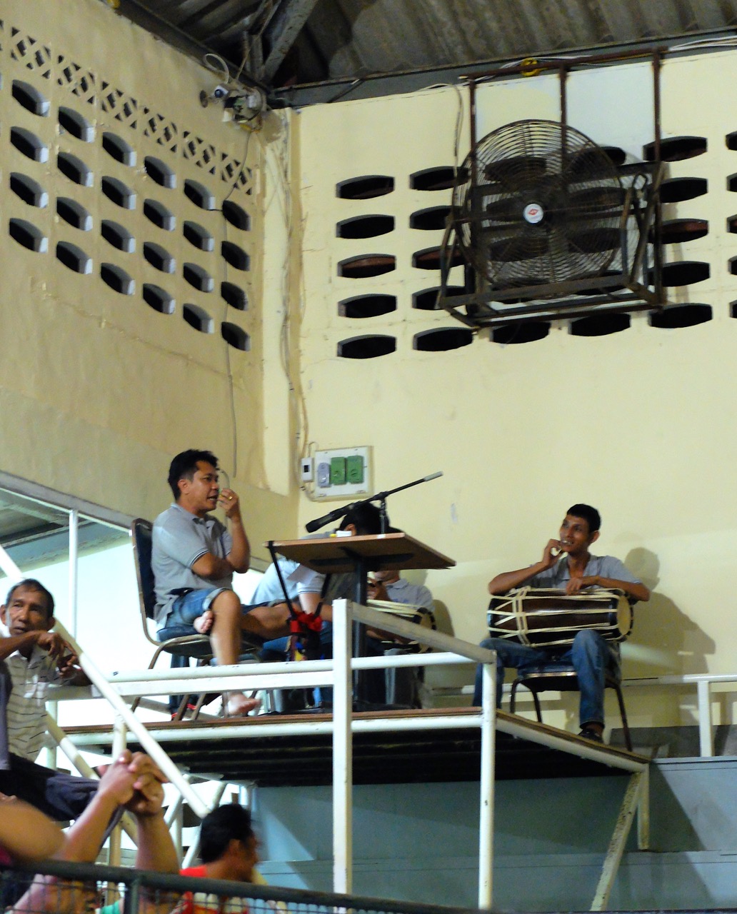 Blaring dance music (top 10 pop) kept up the energy in the crowd! We could see the locals placing wagers on fighters and getting their bets in order. Soon, the players were announced and they came running in and jumping over the ropes…