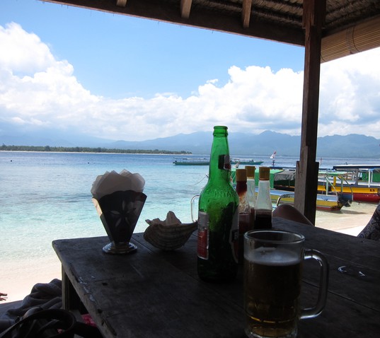 Gili Air has a lovely white sandy beach dotted with bamboo bungalows and little restaurants where you can eat virtually on top of a turquoise sea 🙂